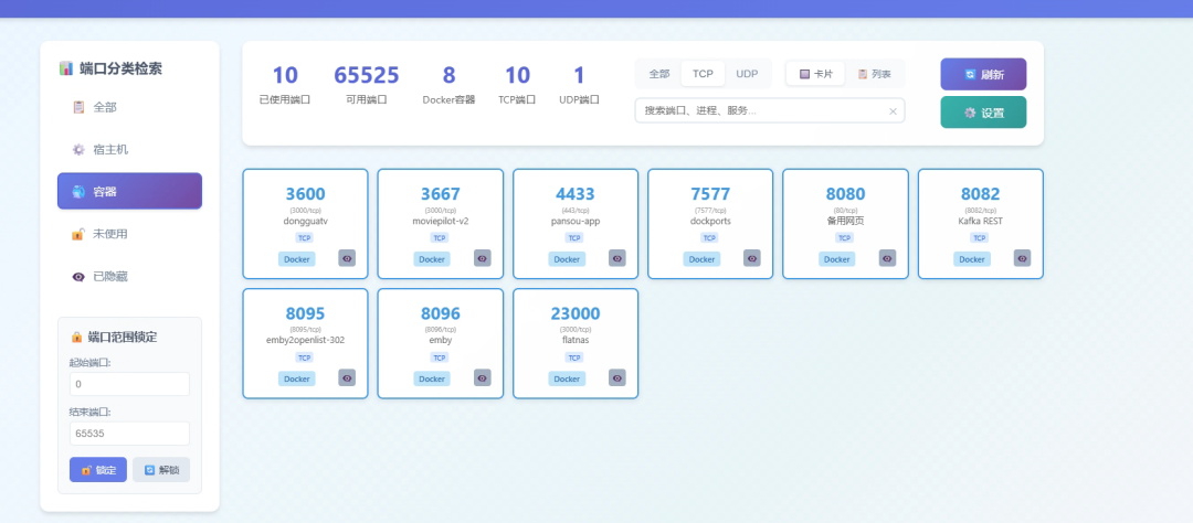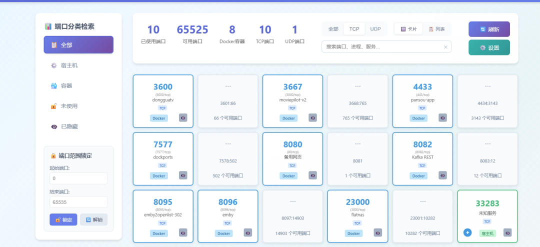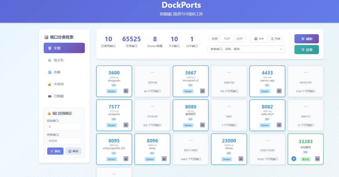 今天给大家介绍一款现代化的 Docker 容器端口监控与可视化工具,它把原本零散、复杂的端口信息,全部“摊平”在一个清爽直观的界面中,让你一眼就能看清当前系统的端口使用情况