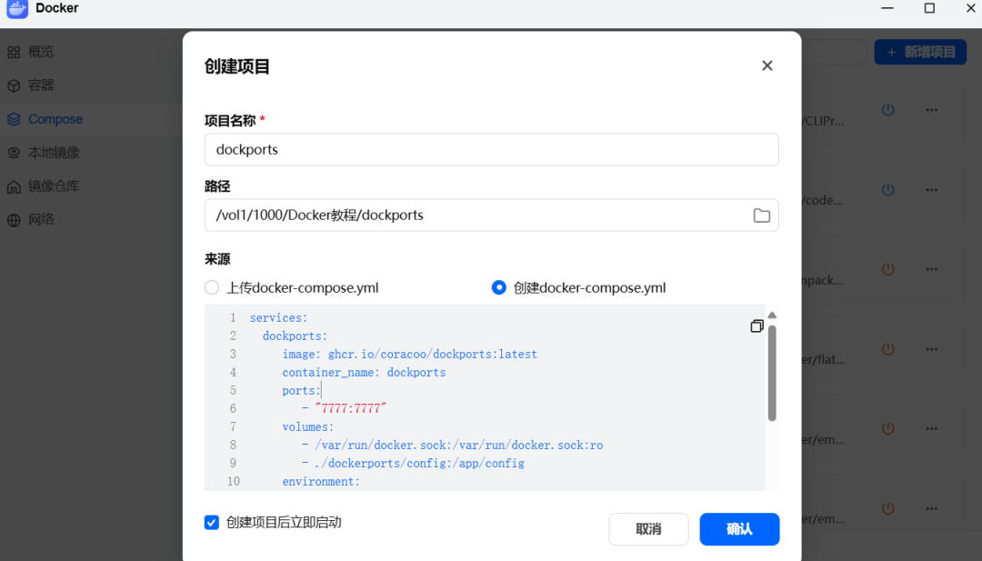 2️⃣ 桌面打开Docker,点击侧栏 Compose -> 新增项目 -> 输入项目名称 -> 设置路径选择前面第1️⃣步创建的文件夹 ->创建docker-compose.yml把下面代码复制进去,点击完成 直至构建完成